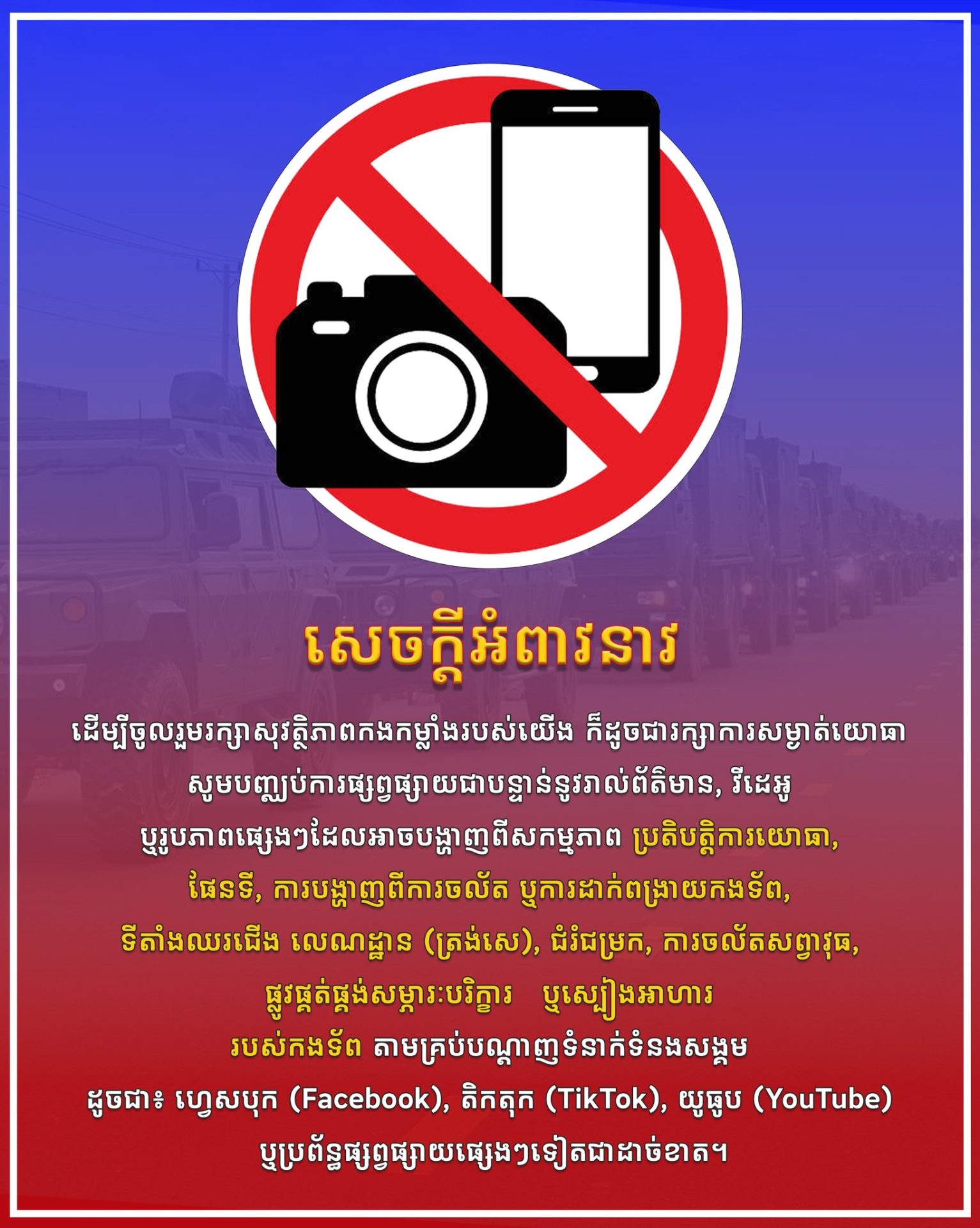 ដើម្បីចូលរួមរក្សាសុវត្ថិភាពកងកម្លាំងរបស់យើង ក៏ដូចជារក្សាការសម្ងាត់យោធា សូមបញ្ឈប់ការផ្សព្វផ្សាយជាបន្ទាន់នូវរាល់ ព័ត៌មាន, វីដេអូ ឬរូបភាពដែលអាចបង្ហាញពីសកម្មភាពប្រតិបត្តិការយោធា, ផែនទី, ការបង្ហាញពីការចល័ត ឬការដាក់ពង្រាយកងទ័ព, ទីតាំងឈរជើង, លេណដ្ឋាន (ត្រង់សេ), ជំរុំជម្រក, ការចល័តសព្វាវុធ, ផ្លូវផ្គត់ផ្គង់សម្ភារបរិក្ខារ ឬស្បៀងអាហារ របស់កងទ័ព តាមគ្រប់បណ្តាញទំនាក់ទំនងសង្គម ដូចជា Facebook, TikToK, Youtube ឬប្រព័ន្ធផ្សព្វផ្សាយផ្សេងៗទៀតជាដាច់ខាត។