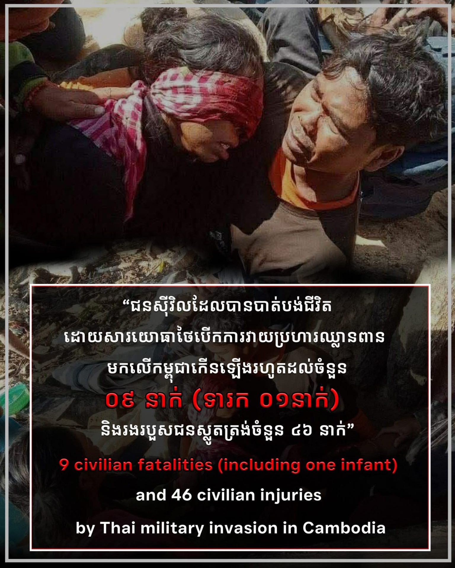សកម្មភាពឈ្លានពានដោយប្រដាប់អាវុធរបស់ថៃបានបង្កឱ្យមានការខូចខាតយ៉ាងធ្ងន់ធ្ងរ ដោយគិតត្រឹមថ្ងៃទី១០ ខែធ្នូ ឆ្នាំ២០២៥នេះ ជនស៊ីវិលបានបាត់បង់ជីវិតកើនឡើងរហូតដល់ចំនួន ៩នាក់ (ទារក ១នាក់) និងរងរបួសជនស្លូតត្រង់ចំនួន ៤៦ នាក់។