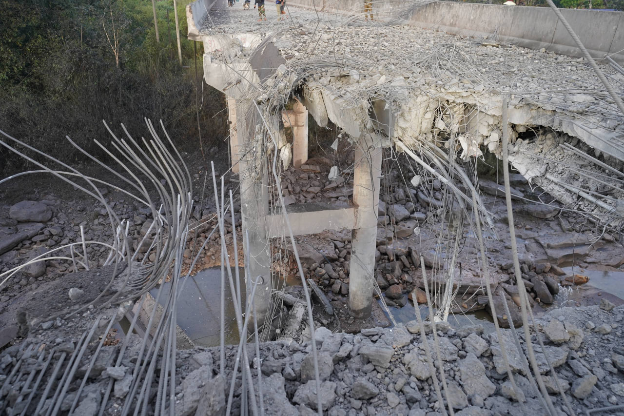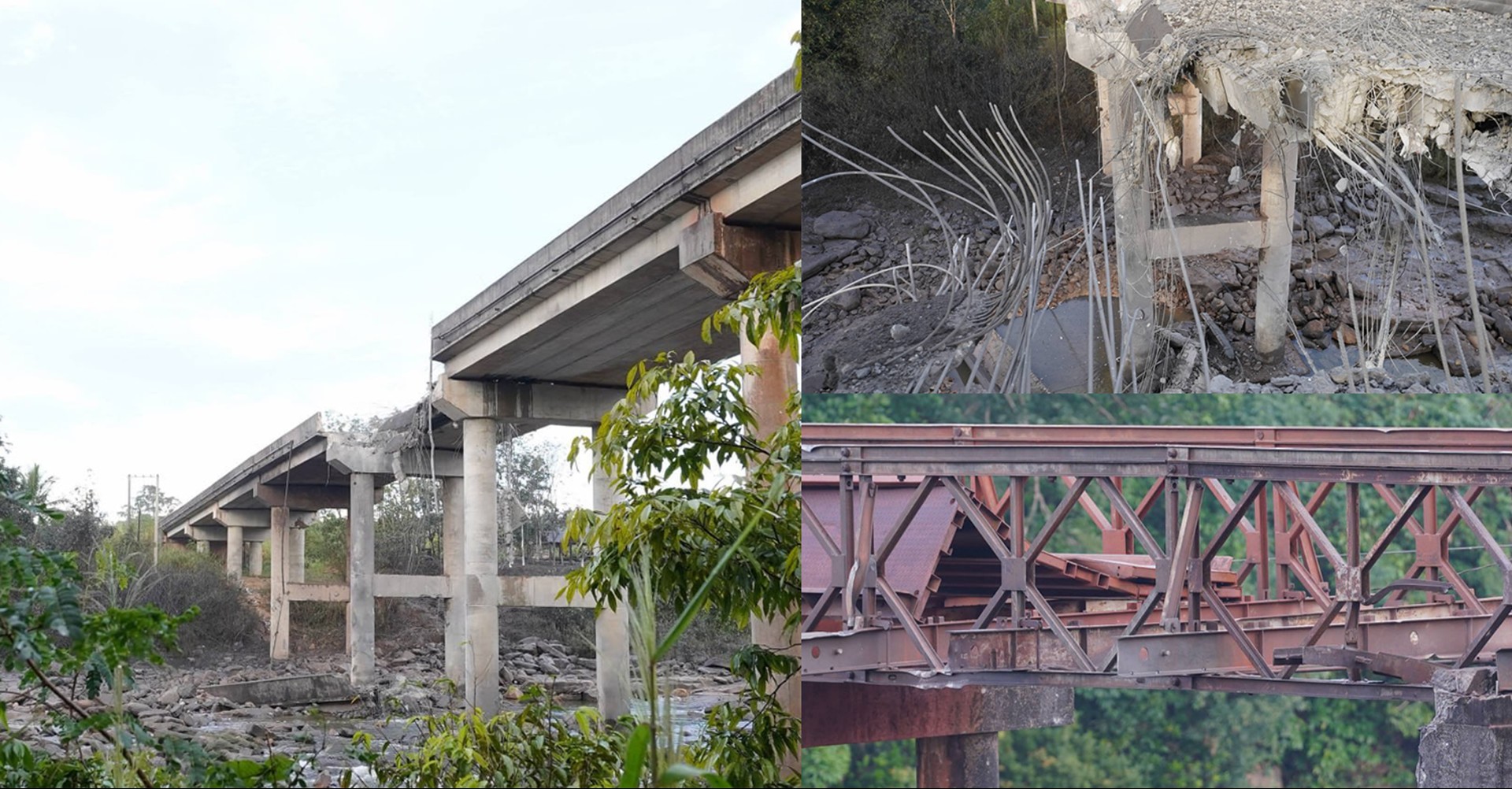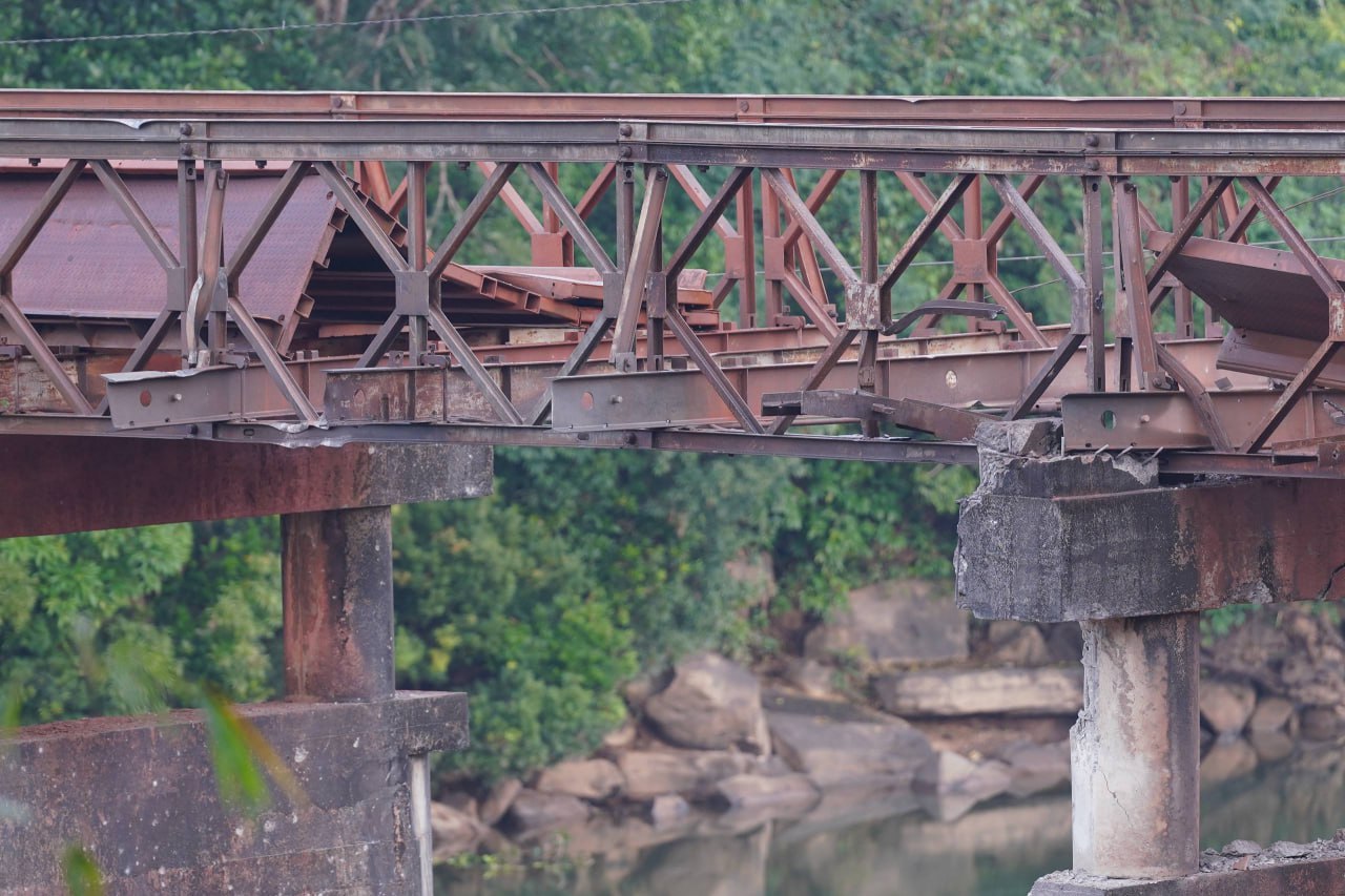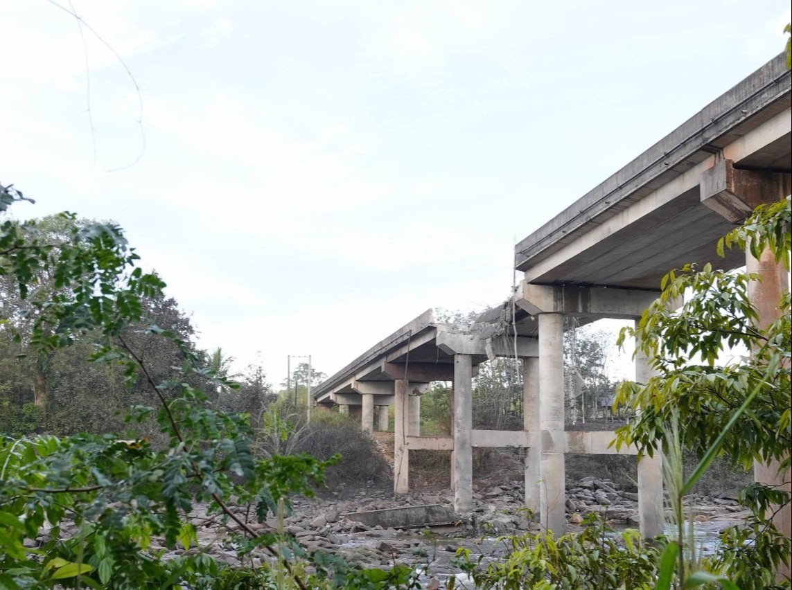 This image shows the damage sustained by the Chey Chumneas Bridge (Me Teuk) in Thmar Da Commune, Veal Veng District, Pursat Province, following an early-morning aerial bombing by Thai forces using F-16 aircraft on December 13, 2025.