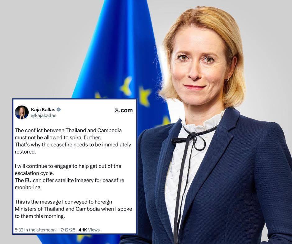 លោកជំទាវ Kaja Kallas តំណាងជាន់ខ្ពស់សហភាពអឺរ៉ុបទទួលបន្ទុកកិច្ចការបរទេស និងគោលនយោបាយសន្តិសុខ និងជាអនុប្រធានគណៈកម្មការអឺរ៉ុប បានចេញសេចក្តីថ្លែងការណ៍ ដោយបានគូសបញ្ជាក់ថាមជម្លោះរវាងប្រទេសកម្ពុជានិងប្រទេសថៃ មិនត្រូវបណ្តោយឱ្យរាលដាលកាន់តែធ្ងន់ធ្ងរឡើយ។ ហេតុដូច្នេះហើយ បទឈប់បាញ់ចាំបាច់ត្រូវតែស្តារឡើងវិញជាបន្ទាន់។