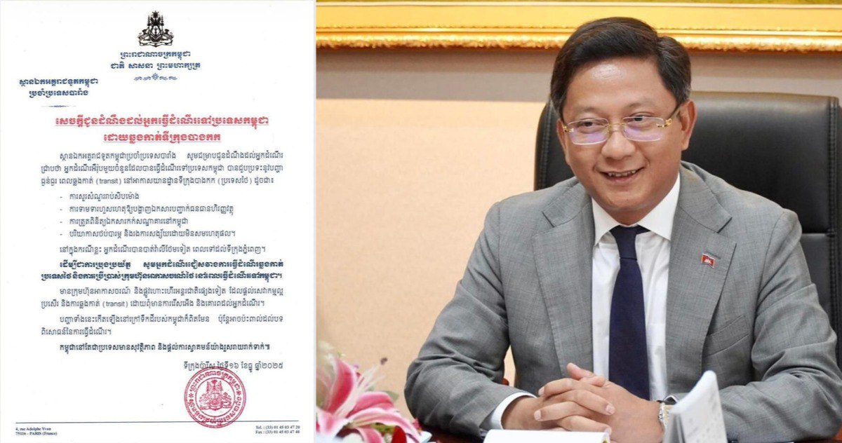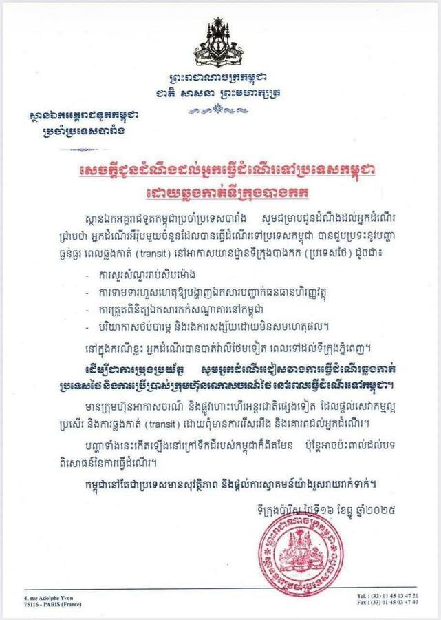 យោងតាមសេចក្តីជូនដំណឹងរបស់ ស្ថានឯកអគ្គរាជទូតកម្ពុជាប្រចាំប្រទេសបារាំង ដល់អ្នកធ្វើដំណើរទៅប្រទេសកម្ពុជា ដោយឆ្លងកាត់ទីក្រុងបាងកកកាលពីថ្ងៃទី១៦ ធ្នូ ឆ្នាំ២០២៥បានលើកឡើងថា ស្ថានឯកអគ្គរាជទូតកម្ពុជាប្រចាំប្រទេសបារាំង សូមជម្រាបជូនដំណឹងដល់អ្នកដំណើរ ជ្រាបថា អ្នកដំណើរអឺរ៉ុបមួយចំនួនដែលបានធ្វើដំណើរទៅប្រទេសកម្ពុជា បានជួបប្រទះនូវបញ្ហា ធ្ងន់ធ្ងរ ពេលឆ្លងកាត់ (transit) នៅអាកាសយានដ្ឋានទីក្រុងបាងកក (ប្រទេសថៃ) ដូចជា៖