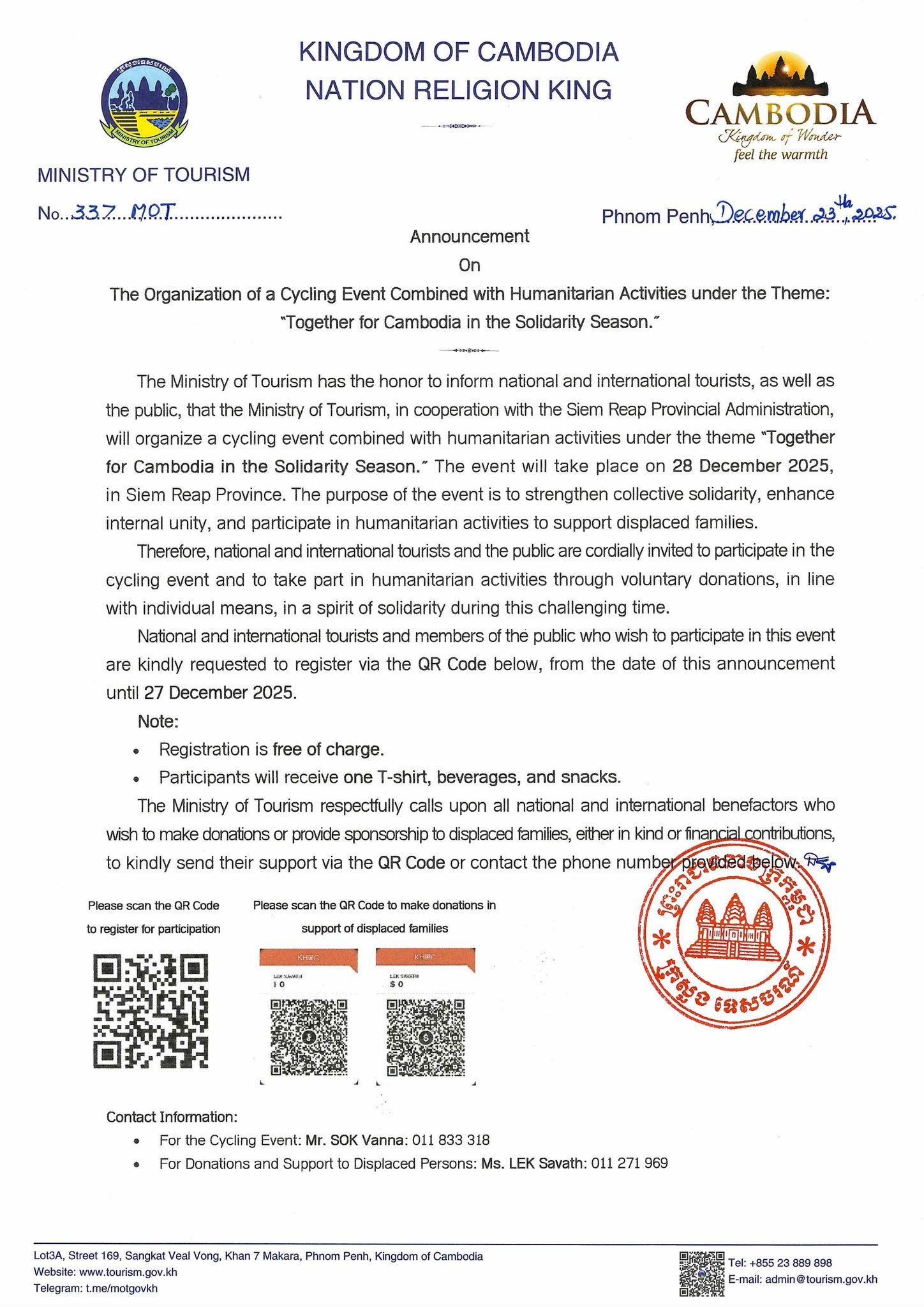 រាជធានីភ្នំពេញ ៖ ក្រសួងទេសចរណ៍ នៅថ្ងៃទី ២៣ ខែធ្នូ ឆ្នាំ ២០២៥ នេះបានឱ្យដឹងថា ក្រសួងទេសចរណ៍សហការជាមួយរដ្ឋបាលខេត្តសៀមរាប នឹងរៀបចំព្រឹត្តិការណ៍ជិះកង់ផ្សារភ្ជាប់នឹងសកម្មភាព មនុស្សធម៌ ក្រោមប្រធានបទ «រួមគ្នាដើម្បីកម្ពុជា ក្នុងរដូវកាលសាមគ្គី» ដែលនឹងប្រព្រឹត្តទៅនៅថ្ងៃទី ២៨ ខែធ្នូ ឆ្នាំ ២០២៥ នៅខេត្តសៀមរាប ក្នុងគោលបំណង ពង្រឹងកម្លាំងសាមគ្គីភាពជាធ្លុងមួយ និងពង្រឹងស្មារតីឯកភាពផ្ទៃក្នុង ព្រមទាំងចូលរួមសកម្មភាពមនុស្សធម៌ ដើម្បីជួយដល់គ្រួសារភៀសសឹក ។